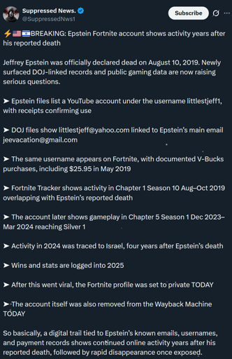 arrow-up11arrow-down1imageAlleged Fortnite and Rocket league account of Jeffrey Epstein playing for years after his death (more info in post)plus-squarelemmy.mlgeneva_convenience@lemmy.ml · edit-23 months agomessage-square0linkfedilink