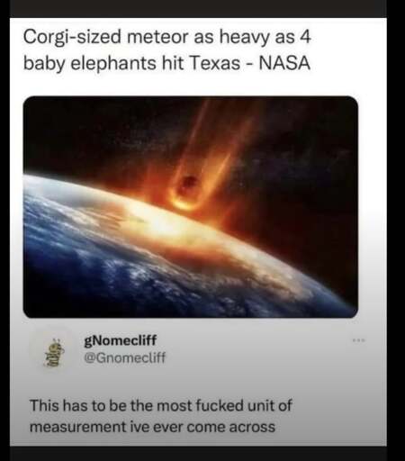 No you see, everyone else in the world exclusively describes the world in accurate SI units, only Americans are dumbfuck enough to measure things in bullets per cheeseburger. Nobody else in the entire world will casually say “it’s the size of a medium dog” because America bad.