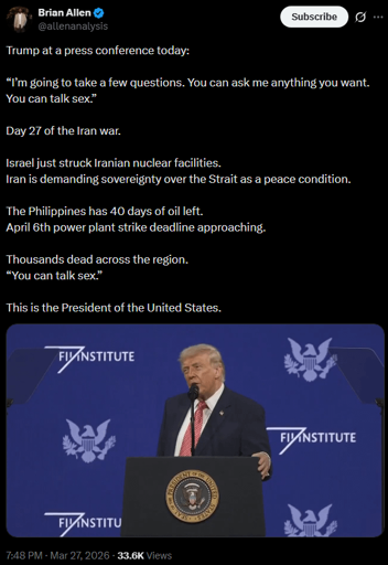 Sunflier@lemmy.world to White People Twitter@lemmy.worldEnglish · 27 days agoTrump wants the media to ask him about sex.lemmy.worldimagemessage-square2linkfedilinkarrow-up12arrow-down10file-text