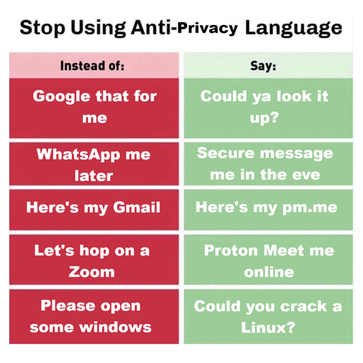 arrow-up1307arrow-down1imageChanging the state of privacy starts with changing how we talk about things. Stop using anti-privacy language, here's a guide 👇lemmy.mlafporritt1001@lemmy.today to DeGoogle Yourself@lemmy.ml · 8 days agomessage-square60linkfedilink