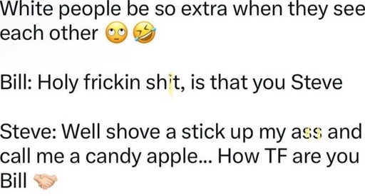 minus-squarecRazi_man@europe.publinkfedilinkarrow-up13·19 hours ago“Jeez Steve, let’s start with coffee and see how it goes before jumping to pegging and dirty talk”.