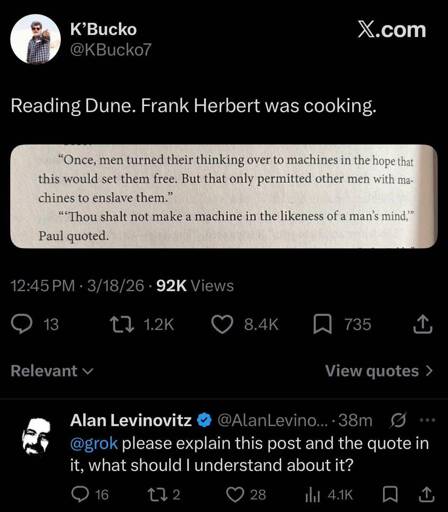 The post quotes Dune (by Frank Herbert): men handed thinking to machines hoping for freedom, but it let other men (with machines) enslave them. Then Paul cites the Orange Catholic Bible: “Thou shalt not make a machine in the likeness of a man’s mind.”“Herbert was cooking” = he crushed it with this. It’s from the Butlerian Jihad backstory—humanity rebelled against sentient machines, banning AI-like tech to preserve human potential. A timeless caution on tech dependence.