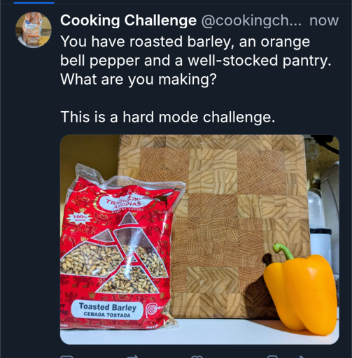 You have roasted barley, an orange bell pepper and a well-stocked pantry. What are you making?