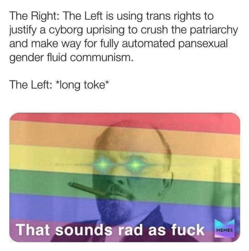 The “fully automated” part seems added, but the rest is common positions of lots of the right just mashed into 1 sentence. Cyborg being a placeholder for the general anti-transhumanism of many transphobes (although not necessary the most common position).