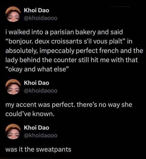 Speaking French like a native is so hard. They basically smush every word together into one long sound. I think the French also may not just say “two croissants please, you need to stick a “je prendre” in front or something. I know people who speak fluent French who still can’t speak to the locals in certain places because they can’t understand you unless you get the accent just right.