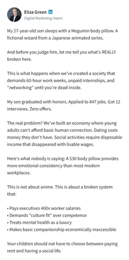like the end needs to reveal this was an ad for her pillow company, and she was actually trying to sell us on the efficiency of the pillow as an opportunity for employers to cut labor costs and wages and a reason people should just settle for a body pillow instead of a livable wage