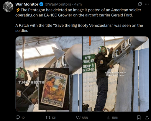 arrow-up11arrow-down1imageUS military "Saving the Big Booty Venezuelans"lemmy.mlgeneva_convenience@lemmy.ml to Progressive Politics@lemmy.world · 19 days agomessage-square0linkfedilinkcross-posted to: [email protected]