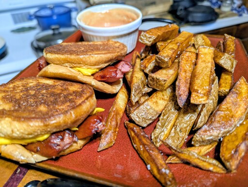 Five guy style twice fried French fries. Hamburger bun grilled cheese with processed cheese food slices, hot dogs from the air fryer. Fry sauce made from mayonnaise, ketchup and malt vinegar.