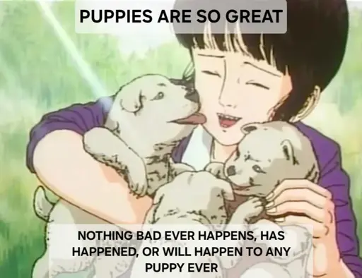 tgirlschierke@lemmy.blahaj.zone to Animemes@ani.socialEnglish · 2 months agoI'm gonna go unpause the movie now. I sure hope nothing bad happens to the puppies! [Midori: The Girl in the Freakshow]lemmy.blahaj.zoneimagemessage-square0linkfedilinkarrow-up12arrow-down10